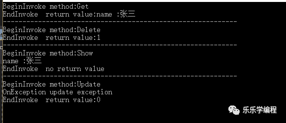 IIntercept intercept = new UserIntercept(); var proxyObject = new UserDao(); var factory = new AutoProxyFatory<IUserDao>(); IUserDao userDao = factory.Build(proxyObject, intercept); string ret1 = userDao.Get("张三"); Console.WriteLine("------------------------------------------------------------"); int ret2 = userDao.Delete(1); Console.WriteLine("------------------------------------------------------------"); userDao.Show("张三"); Console.WriteLine("------------------------------------------------------------"); userDao.Update("张三", 2);