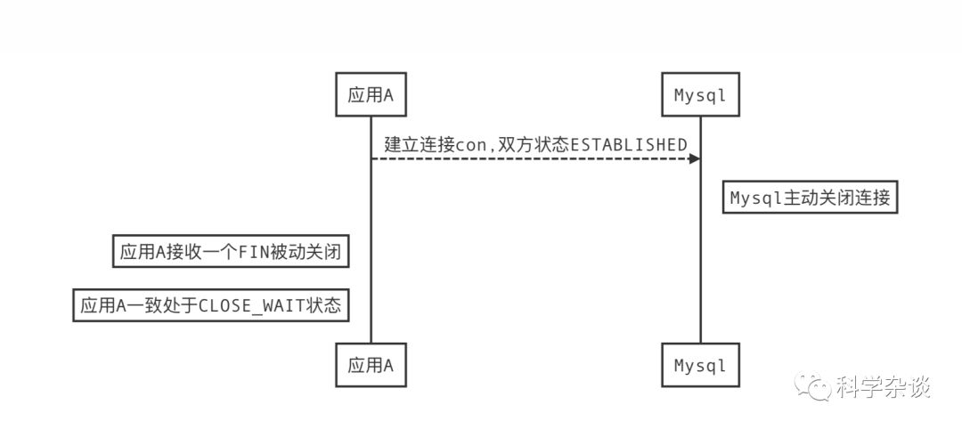 应⽤用A与mysql之间建⽴立连接con,状态 双⽅方ESTABLISHED,mysql会话超时后主动关闭连接