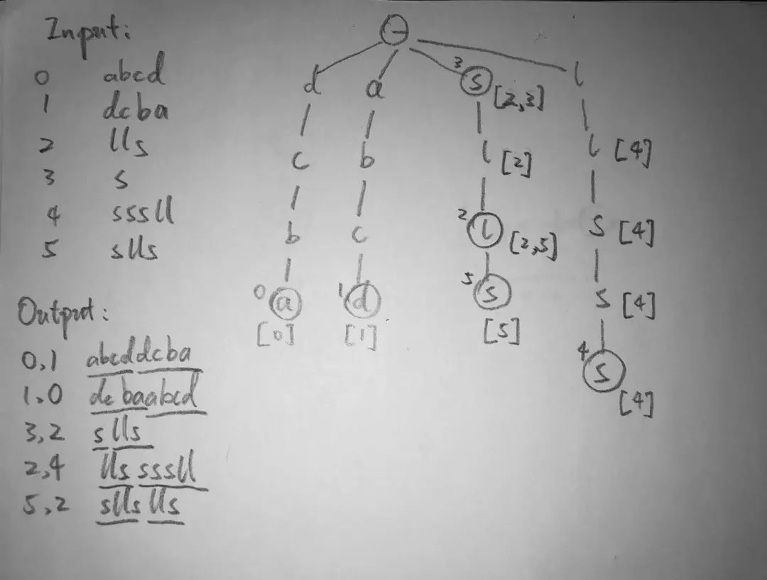 图中带圈的节点表示一个单词的结尾。圆圈左上标表示index,表示第几个单词。反向建trie过程中,每添加一个字母,同时检查该字母后面的substring是不是一个回文。如果是回文则将index存入list中。节点下方括号存list值。例如s下存[2,3],表示如果有单词正好匹配到s这里结束,那么对于单词2和单词3都能与其形成回文。因为单词2、3的后部分自己形成回文。