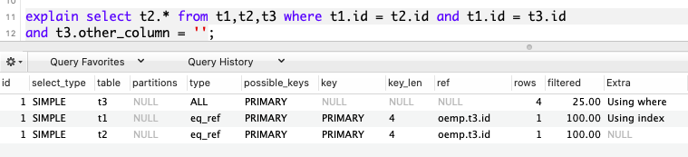 explain select t2.* from t1,t2,t3 where t1.id = t2.id and t1.id = t3.id