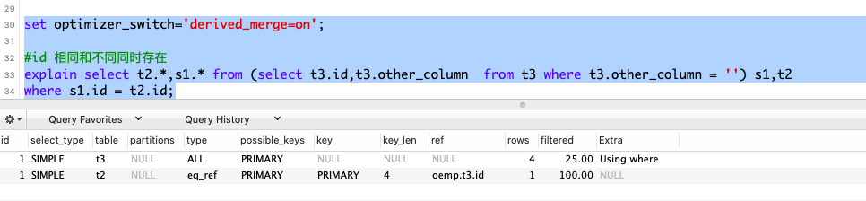 说白了,如果设置为 on 那么就不会出现 derived_merge 行 结果如下: