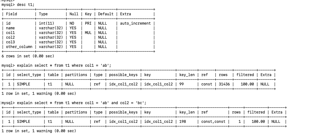 explain select * from t1 where col1 = 'ab' and col2 = 'bc';