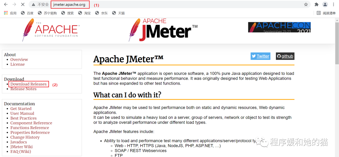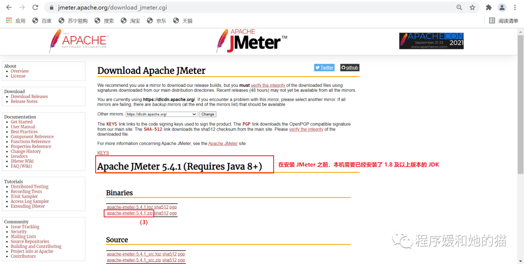 JMeter 官网下载安装包,JMeter 官网下载地址:https://jmeter.apache.org/,见图1、2,下载下来的 JMeter 安装包见图3。