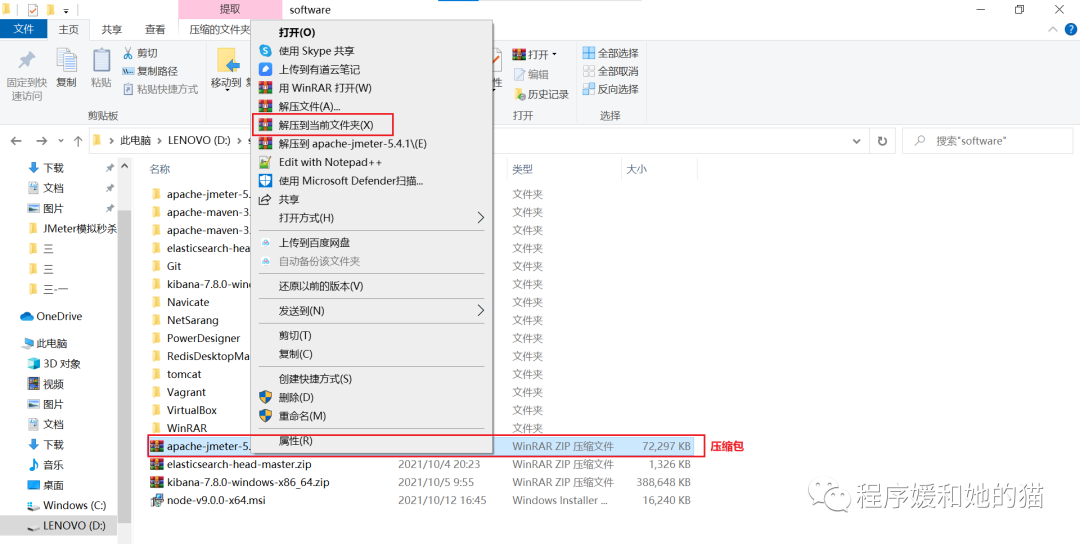 首先将压缩包从下载目录移动到 D:\software 目录,右键压缩包,选择“解压到当前文件夹”。