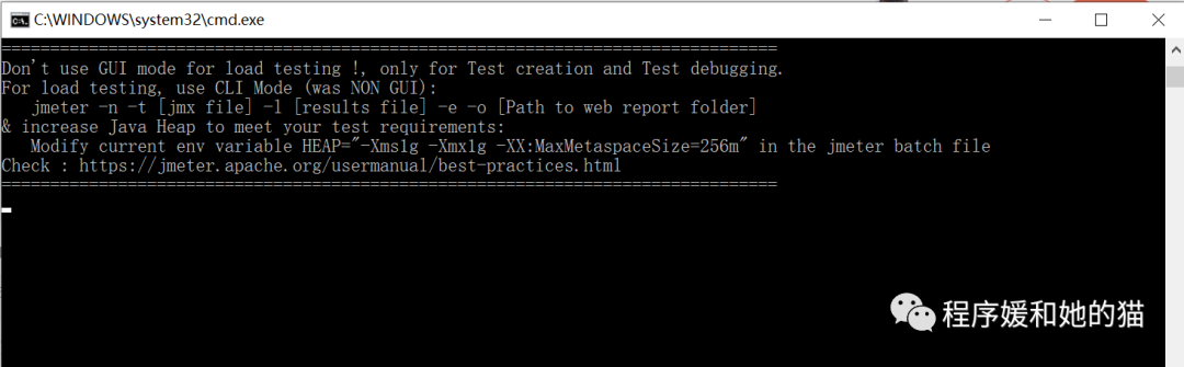 注意:双击 jmeter.bat 启动 JMeter 的时候会有两个窗口,Jmeter 的命令窗口(图7)和 Jmeter 的图形操作界面(图8),不可以关闭命令窗口。