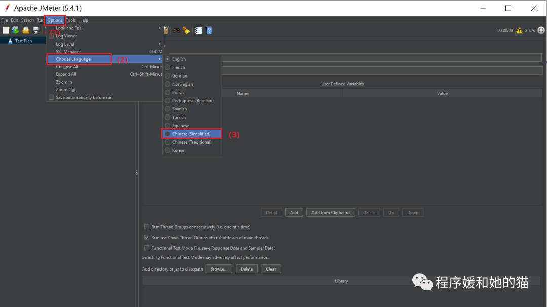 JMeter 默认界面语言是英文,为了方便,我们将其切换成中文,有两种方式,临时切换和永久切换,临时切换,下次重启 JMeter ,又变回英文了,永久切换,下次重启仍然是中文。