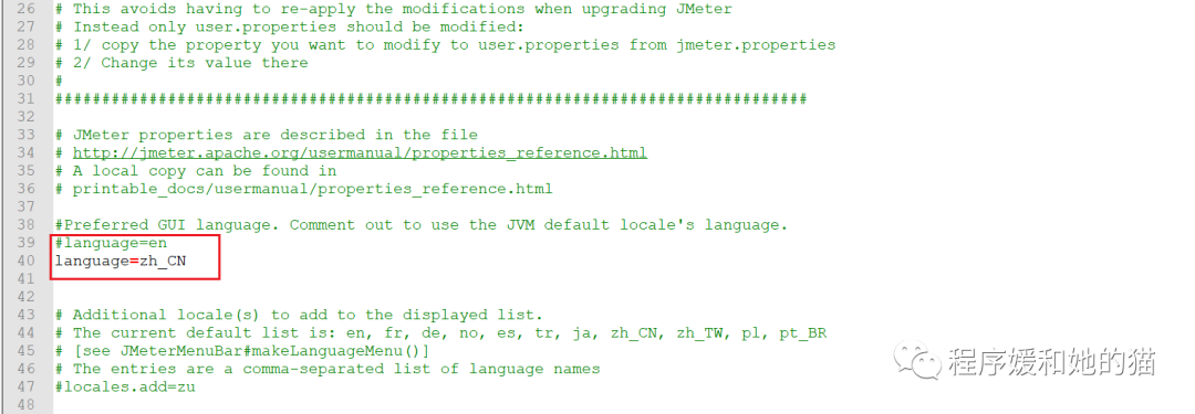 修改 JMeter 配置文件,进入 bin 目录,找到 jmeter.properties 文件,使用编辑器打开,在 #language=en 下面插入一行 language=zh_CN,修改后保存,然后重启 JMter。以后每次启动 Jmeter 界面显示的都是简体中文。