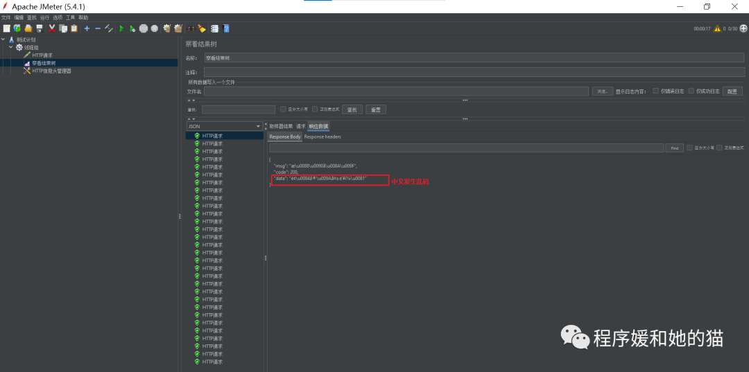 JMeter 下载下来之后,默认编码是 ISO-8859-1,但是使用这种编码方式,如果 HTTP 响应中包含中文,就会出现中文乱码的问题,见图12。