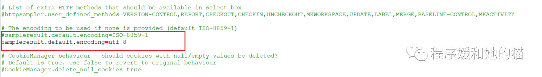 进入 bin 目录,找到 jmeter.properties 文件,使用编辑器打开,在 #sampleresult.default.encoding=ISO-8859-1 下面插入一行 sampleresult.default.encoding=utf-8,修改后保存,然后重启 JMeter。