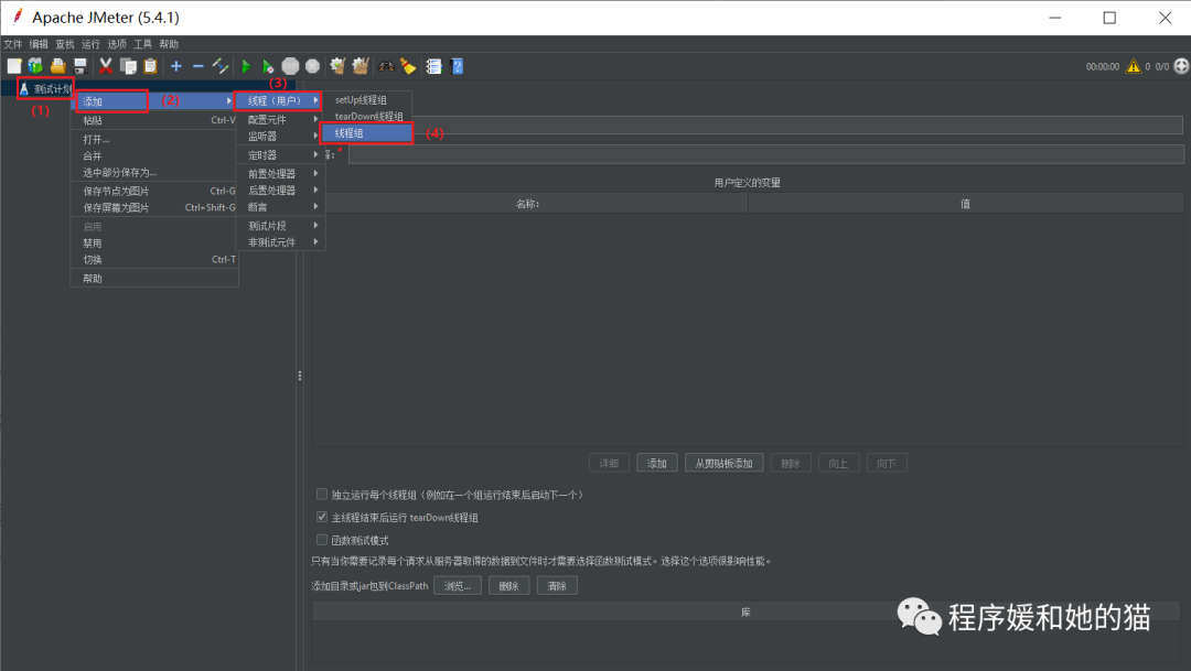 右键点击 "测试计划” → “添加” → “线程(用户)” → “线程组”