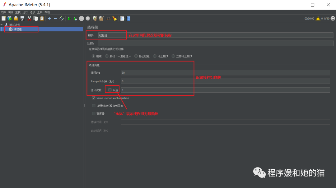 线程数:虚拟用户数。一个虚拟用户占用一个进程或线程,模拟多少用户访问就填写多少个线程数。 Ramp-Up(秒):设置的虚拟用户数需要多长时间全部启动。如果线程数为100,Ramp-Up 为 5 秒,那么需要 5 秒钟启动 100 个线程,也就是每秒钟启动 20 个线程,相当于每秒模拟20个用户进行访问。Ramp-Up 设置为 0 既是并发访问。 循环次数:如果线程数为 100,循环次数为 100。那么总请求数为 100*100=10000 。如果勾选了“永远”,那么所有线程会一直发送请求,直到选择停止运行脚本。