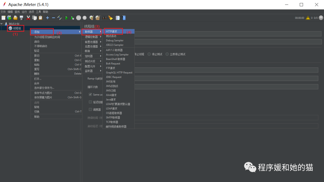 右键点击 “刚才创建的线程组” → “添加” → “取样器” → “HTTP请求”