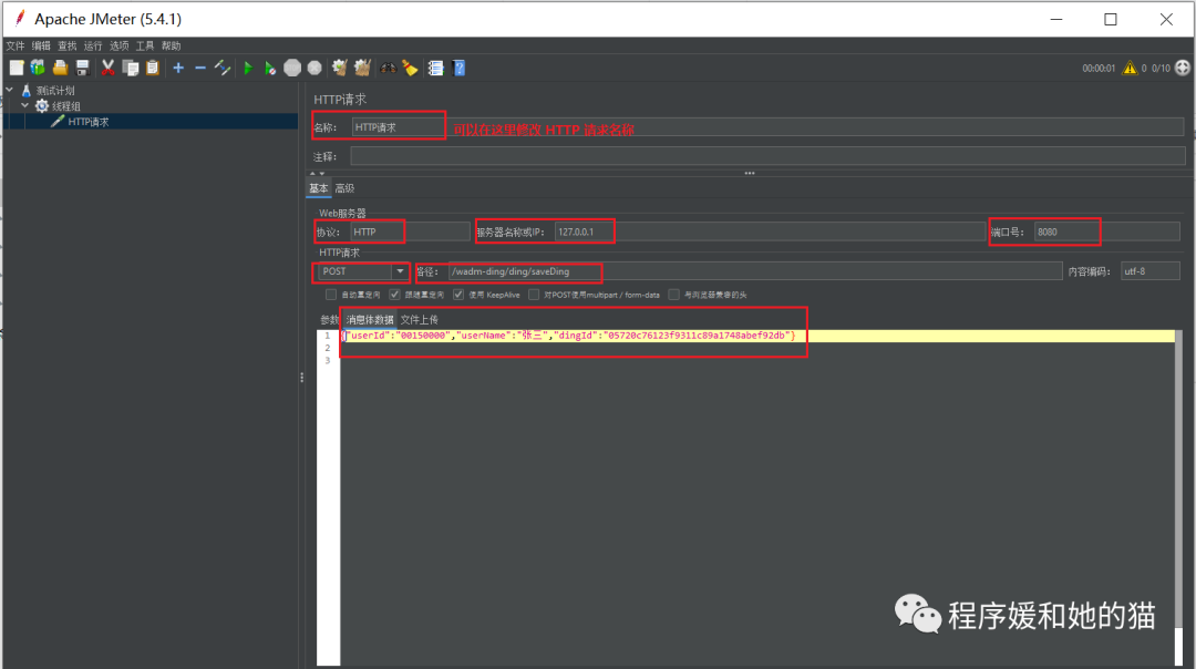 协议:向目标服务器发送HTTP请求协议,可以是 HTTP 或 HTTPS,默认为 HTTP。 服务器名称或IP :HTTP请求发送的目标服务器名称或IP,我们这里是要测试本地接口,所以服务器名称或IP为 localhost 或者 127.0.0.1。 端口号:目标服务器的端口号,我们这里是 8080。 方法:发送 HTTP 请求的方法,可用方法包括GET、POST、HEAD、PUT、OPTIONS、TRACE、DELETE等,我们这个接口使用 POST 访问。 路径:目标 URL 路径,即 URL 中去掉服务器地址、端口及参数后剩余的部分,我们这里是 xxx/ding/saveDing,xxx 是应用名称(spingboot 项目中的 spring.application.name)。 内容编码:编码方式,默认为ISO-8859-1编码,我们这里配置为 utf-8。 参数:接口参数,如果是GET请求,我们将参数设置在参数表中,表中每一行为一个参数(key:参数名,value:参数值),注意参数传入中文时需要勾选“编码”,如果是POST请求,我们可以将参数以JSON方式写在消息体数据框中。