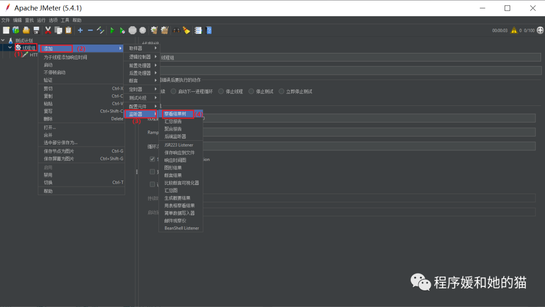 右键点击 “刚才创建的线程组” → “添加” → “监听器” → “察看结果树”