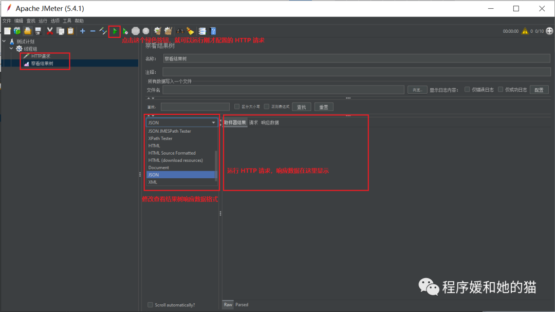 然后修改响应数据格式,我这里用的是JSON格式,运行上面的 HTTP 请求,就可以在取样器结果中看到本次请求返回的响应数据。
