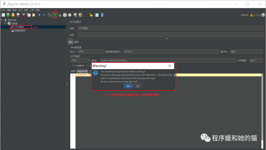 选择你要运行的 HTTP 请求,点击上侧的绿色三角形,运行该 HTTP 请求,此时界面会弹出一个提示框,大概意思是“是否要在测试之前保存这个测试案例”,一般选择“No”或者 X 掉就行。