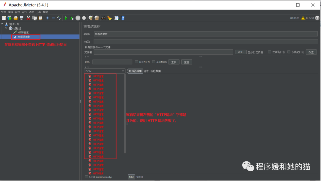 HTTP 请求运行起来之后,察看结果树会显示请求运行结果。此时发现察看结果树中 “HTTP请求”字样是红色的,说明 HTTP 请求失败了,见图25。