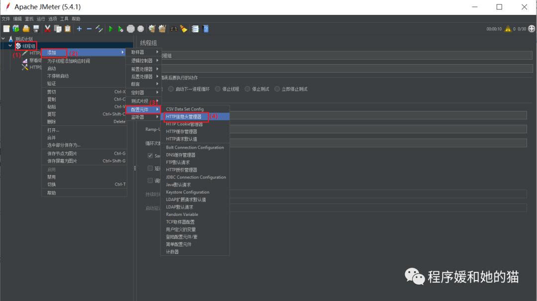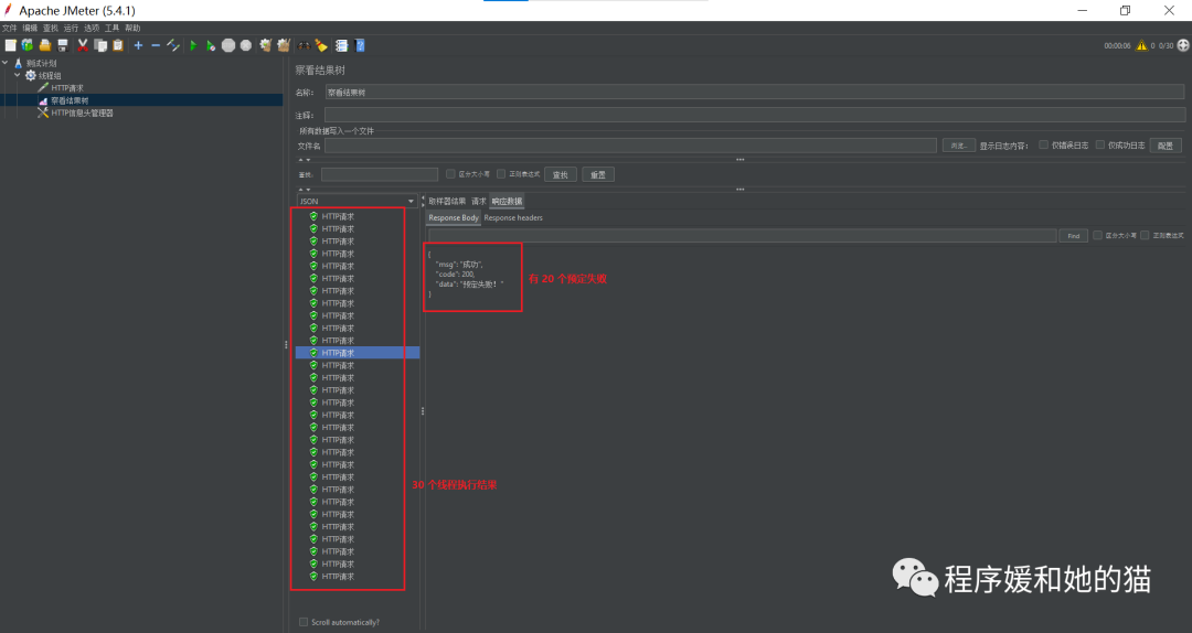 因为我想模拟 30 个人同一时间去预定 10 台跑步机,所以我设置的参数如下,线程数:30,Ramp-Up:0(模拟 10 个线程在同一时间并发执行),循环次数:1,总请求数 30*1=30 次,见图17。