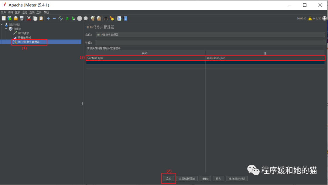 右键点击 “刚才创建的线程组” → “添加” → “配置元件” → “HTTP信息头管理器”,见图27,在 HTTP 信息头管理器中,将 Content-Type 修改为 application/json,见图28。