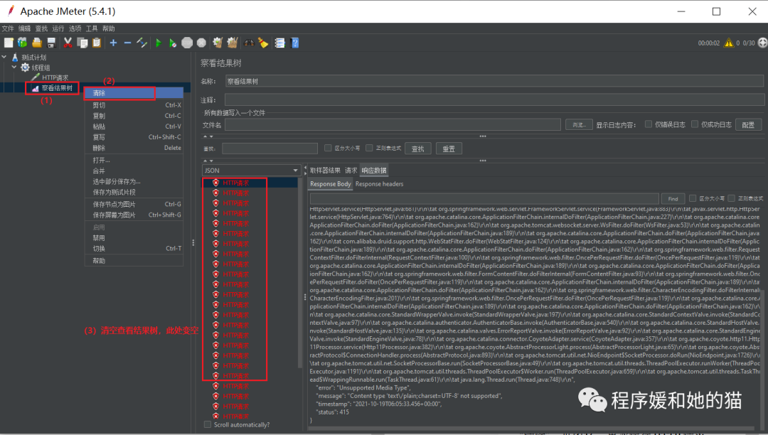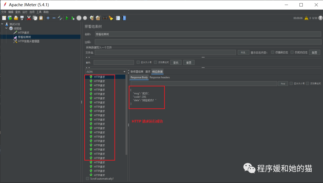 将察看结果树清除,“右键察看结果树” → “清除”,见图29,再次运行 HTTP 请求,此时查看结果树中的“HTTP请求”字样是绿色的,表示HTTP请求成功,见图30。