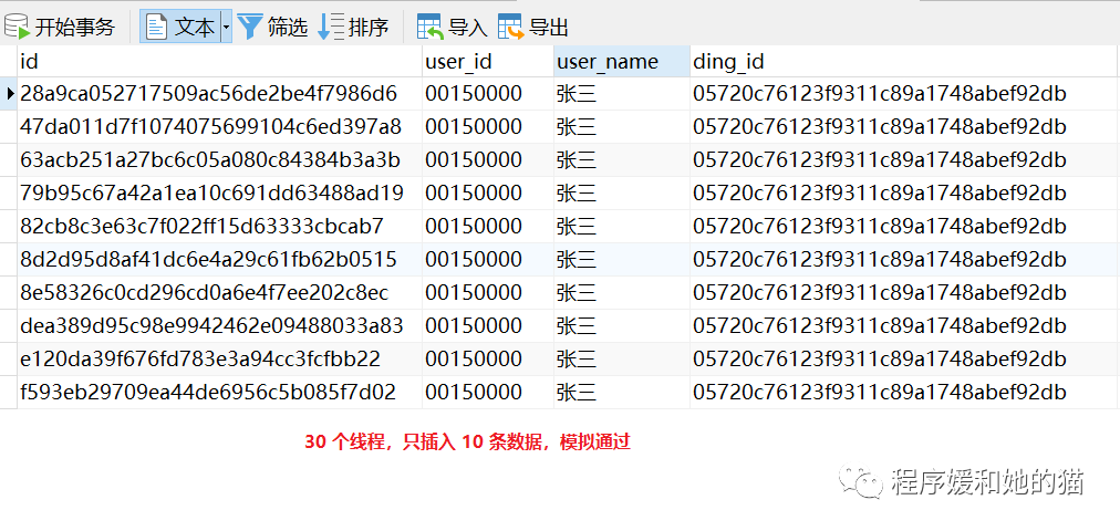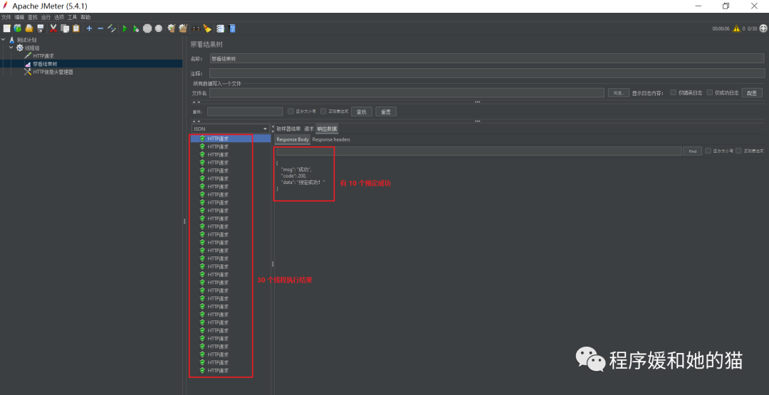 查看模拟结果,30 个用户,10 个预定席位,察看结果树中,30 个请求,有 10 个预定成功,20个预定失败,见图31、32,再看预定详情表,只插入了 10 条数据,见图33,综上这些说明秒杀模拟成功了。