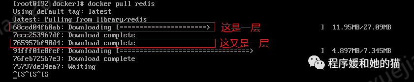 (a)docker pull redis,见图 5 的下载过程,我们可以看到镜像是一层一层下载的。
