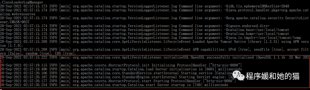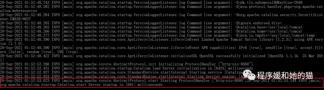 我们看 tomcat 启动日志,出现如图14的 startup 日志,表示 tomcat 启动成功。
