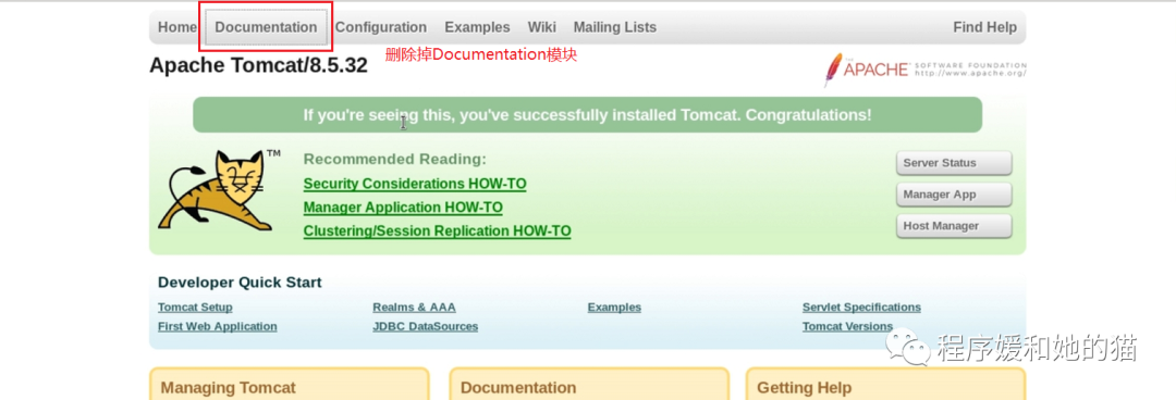 (c)接下来我们修改上一步生成的 tomcat 容器。我们删除 tomcat 容器里面的官方说明文档(即 tomcat 目录中的 docs 文件夹,也即 tomcat运行界面中的 Documentation 模块,见图16),生成一个新的容器。