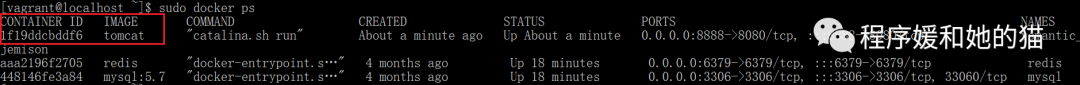 第一步:获取生成的 tomcat 容器的ID,docker ps,见图 15,我们可以知道 tomcat 容器的容器 ID 为 1f19ddcbddf6。
