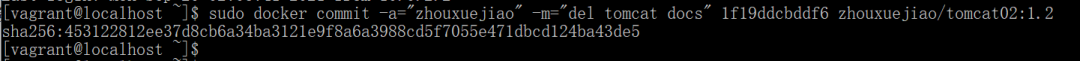 docker commit -a="zhouxuejiao" -m="del tomcat docs" 1f19ddcbddf6 zhouxuejiao/tomcat02:1.2,使用这个命令,根据我们修改后的容器,会生成一个新的镜像。
