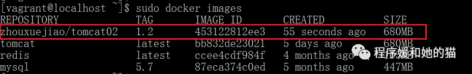 docker images,使用这个命令查看所有镜像,发现有我们要生成的新镜像 zhouxuejiao/tomcat02。