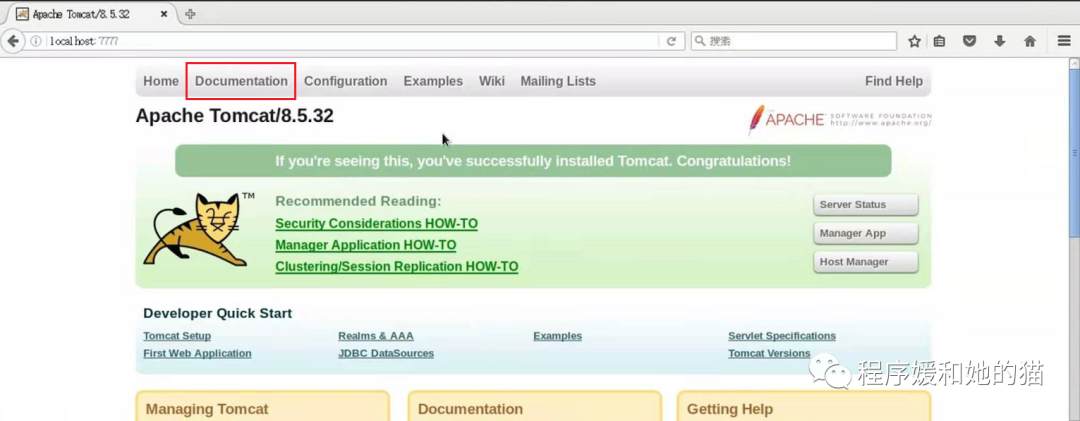 或者在本机的centos上访问 localhost:8888,出现 tomcat 那只猫,也表示 tomcat 启动成功,见图15。