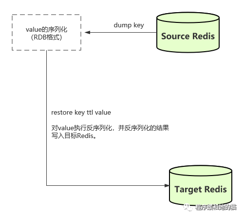 使用dump+restore,有一点需要注意,整个迁移过程并非原子性的,而是通过客户端分步完成的(source redis的客户端:将源Redis需要迁移的键对应的值执行序列化,target redis的客户端:执行反序列化,并将反序列化的结果写入目标Redis)。