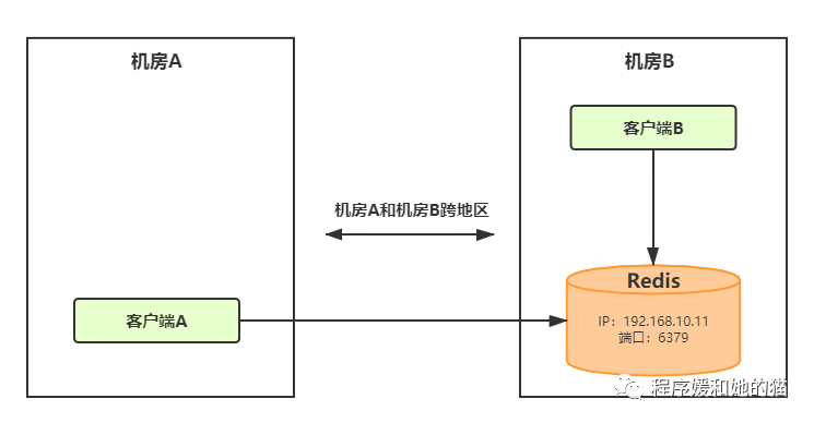 见下图,客户端B和Redis实例都在机房B,客户端A在机房A,机房A和机房B是跨地区的。