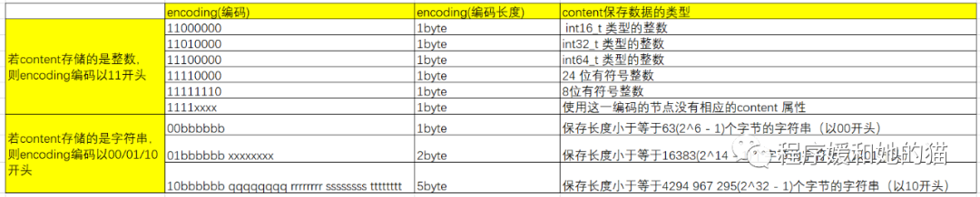encoding属性记录了节点的content属性所保存数据的类型以及长度,ziplist通过这个字段来决定后面的content内容的形式。