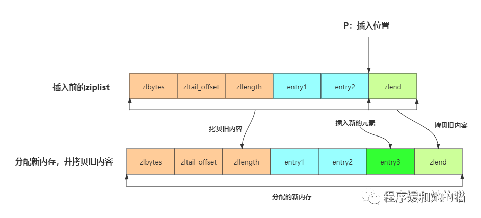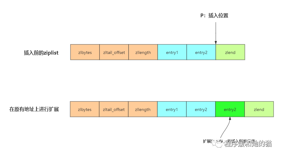 因为ziplist在内存中是紧凑存储,没有冗余空间的,所以插入一个新的元素就需要扩展内存大小。如何扩展内存取决于当前ziplist的内存大小,可能会重新分配新的内存空间,并将之前的内容一次性拷贝到新的地址,也可能在原有的地址上进行扩展,这时就不需要进行旧内容的内存拷贝。