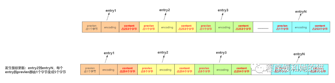 这意味着如果某个entry经过修改操作从253字节变成了254字节,那么它的下一个 entry的prevlen字段就要更新,从1个字节扩展到5个字节;如果这个entry的长度本来也是253字节,那么后面entry的prevlen字段还得继续更新。如果ziplist里面每个entry恰好都存储了253字节的内容,那么第一个entry内容的修改就会导致后续所有entry的级联更新,这就是一个比较耗费计算资源的操作,要尽量避免这种情况的发生。