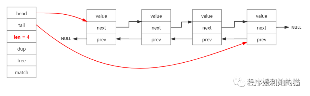 (2)、list自带保存链表长度的字段len,使得获取链表长度的时间复杂度为O(1)。