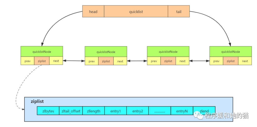 quicklist是ziplist和linkedlist的混合体,它将linkedlist按段切分,每一段使用ziplist来紧凑存储,多个ziplist之间使用双向指针串接起来。