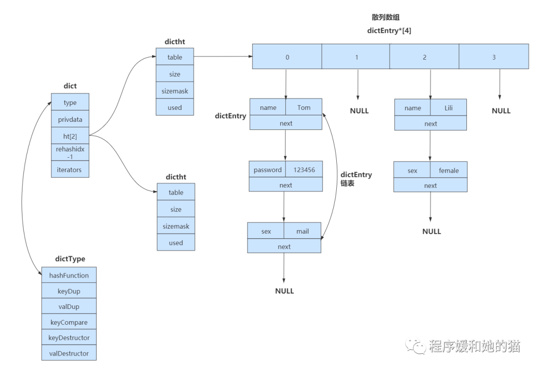 dictht ht[2];// 一个字典中有两个哈希表,ht[0]和ht[1],类型是dictht