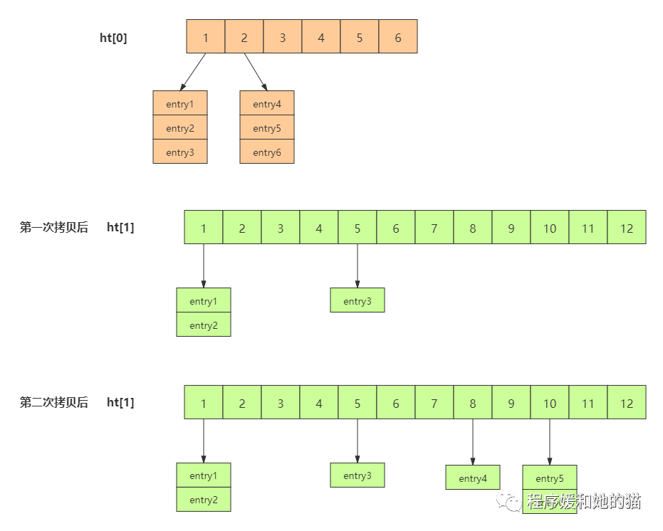 渐进式rehash过程:简单来说就是在第二步拷贝数据时,Redis仍然正常处理客户端请求,每处理一个请求时,从ht[0]中的第一个索引位置开始,顺带着将这个索引位置上的所有entries拷贝到ht[1]中;等处理下一个请求时,再顺带拷贝ht[0]中的下一个索引位置的entries。如下图所示:
