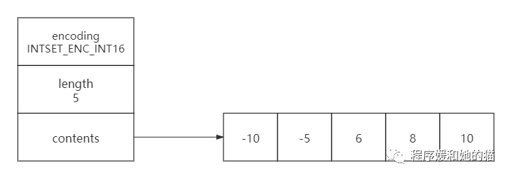 encoding:contents数组中元素的类型,有INTSET_ENC_INT16、INTSET_ENC_INT32和INTSET_ENC_INT64三种,分别表示contents数组中元素类型为 int16_t(16位二进制)、int32_t 和 int64_t 类型。 length:记录了intset(整数集合)包含的元素数量,也即contents数组的大小。 contents:intset整数集合的每个元素都是contents数组的一个数组项,各个数据项在数组中按值的大小从小到大有序地排列,数组中不包含重复项。