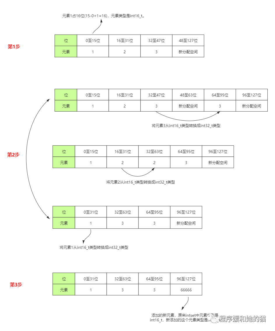 如果我们想要添加一个新元素到intset整数集合里面,但是新元素的类型比整数集合原有的元素类型都要长时,我们就要对整数集合进行升级,然后才能将新元素添加到整数集合里面。