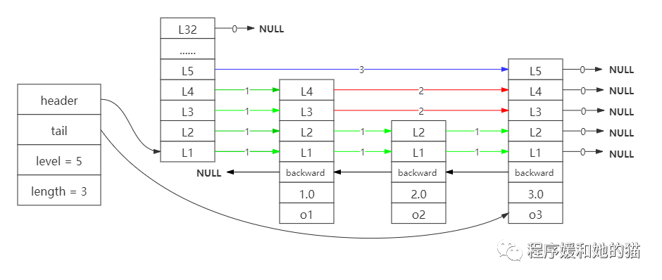 double score;// 见下图各个节点中1.0、2.0、3.0,是节点保存的分值,在跳跃表中节点按照各自保存的分值从小到大排列