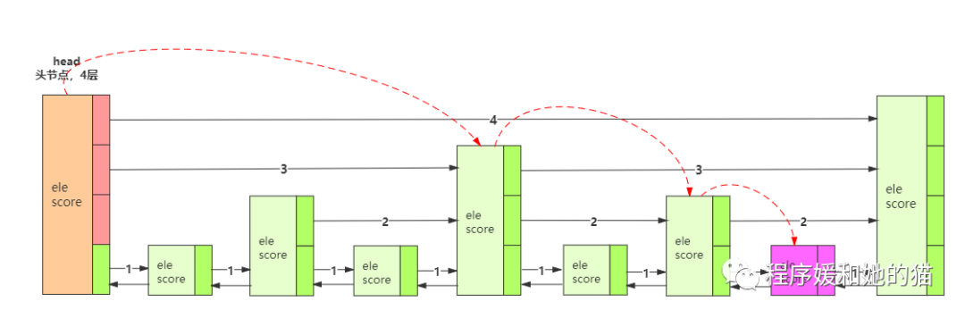 节点使用指针串起来形成了双向链表结构,它们是有序排列的,从小到大,score值小的排在前面,score值大的排在后面。