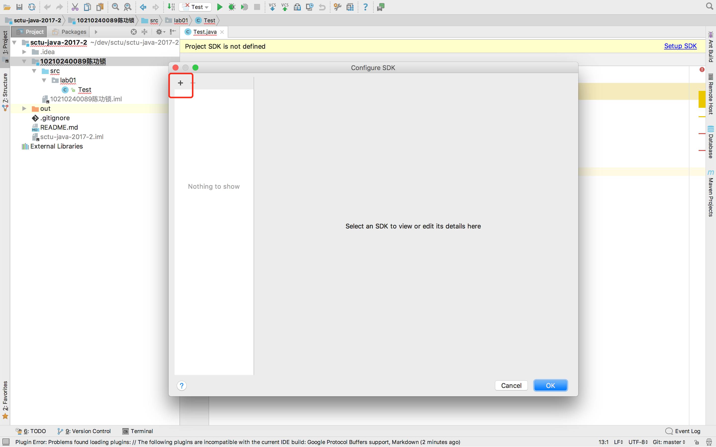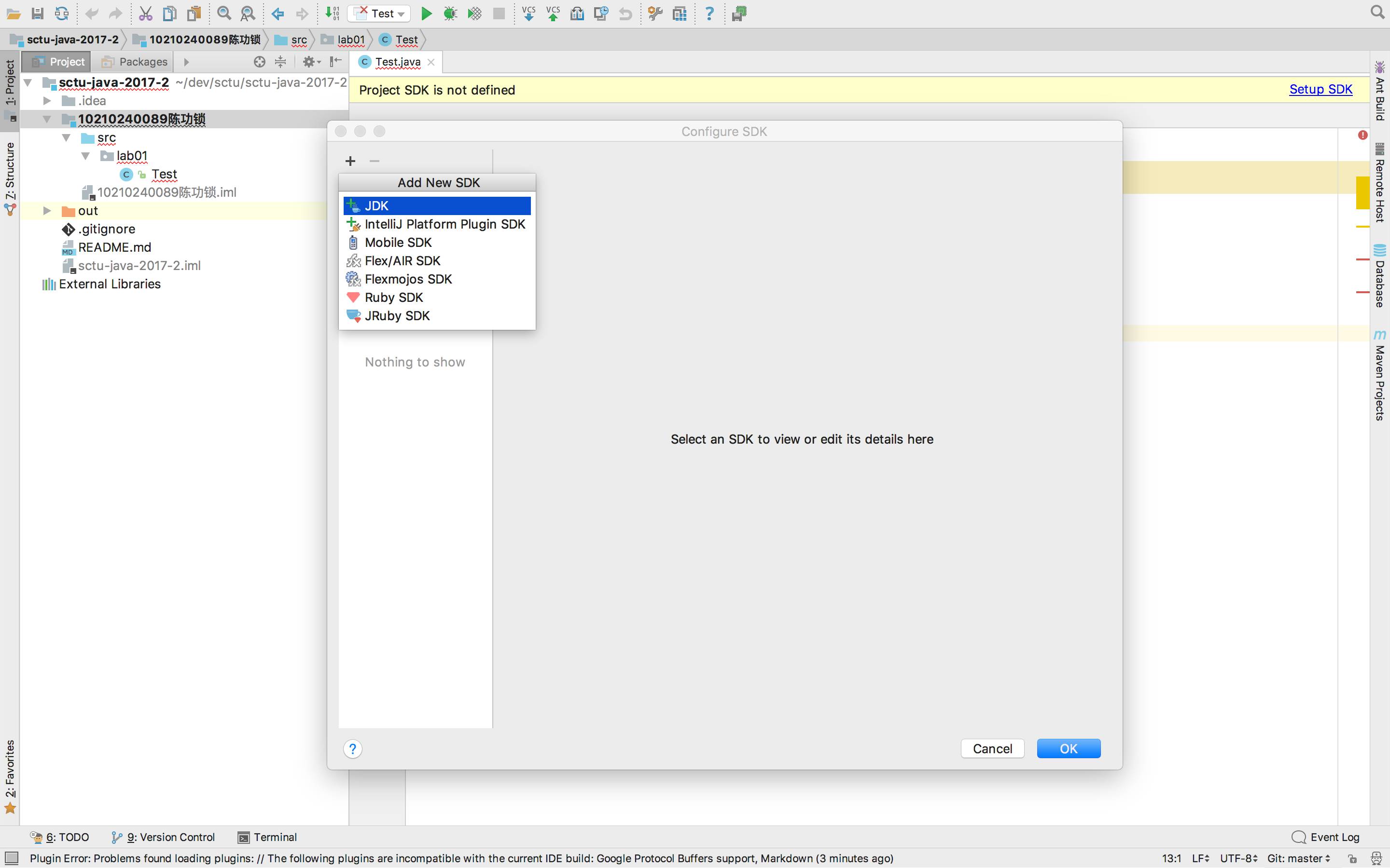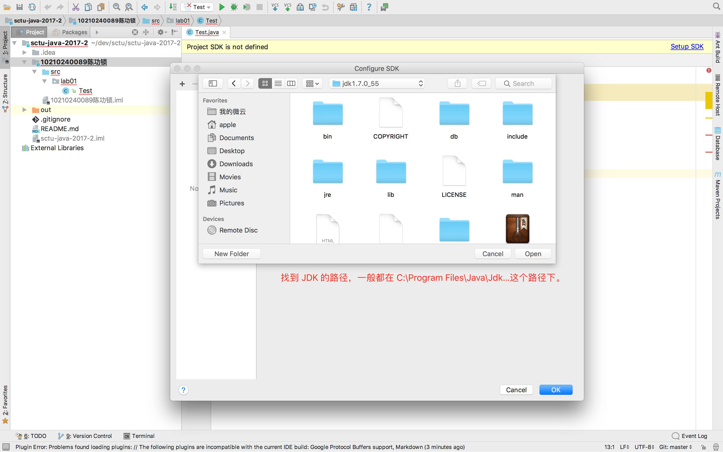 Idea 中所有飘红的地方表示出错了,上述图例也不例外,由于缺少 JDK 的路径导致出错。解决方法如下: