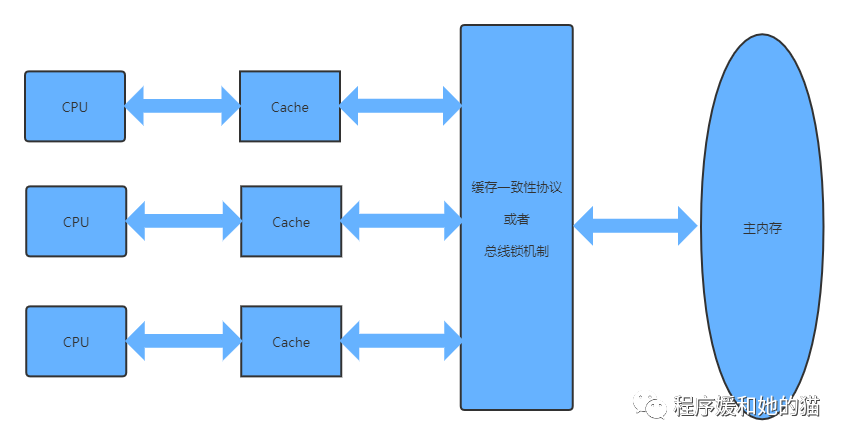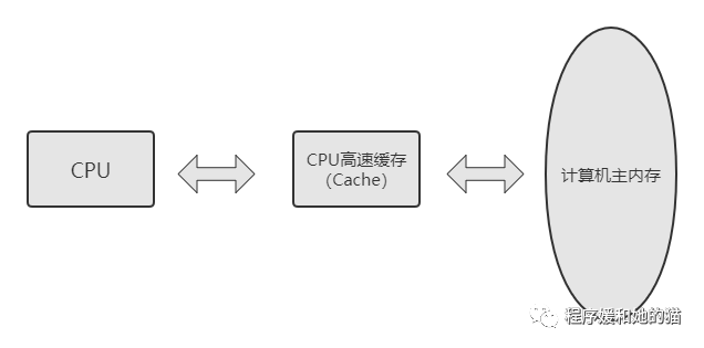 所以现代计算机系统在CPU中加入了一层读写速度尽可能接近CPU处理器运算速度的高速缓存(Cache),来解决CPU和内存等其他硬件之间的速度矛盾:当程序在运行过程中,会将运算需要的数据从主存复制一份到CPU的高速缓存当中,那么CPU进行计算时就可以直接从它的高速缓存读取数据,当CPU运算结束,将运算结果写入高速缓存,最后把高速缓存中的运算结果同步回内存之中,这样CPU处理器就无须等待缓慢的内存读写了,图示见图2。