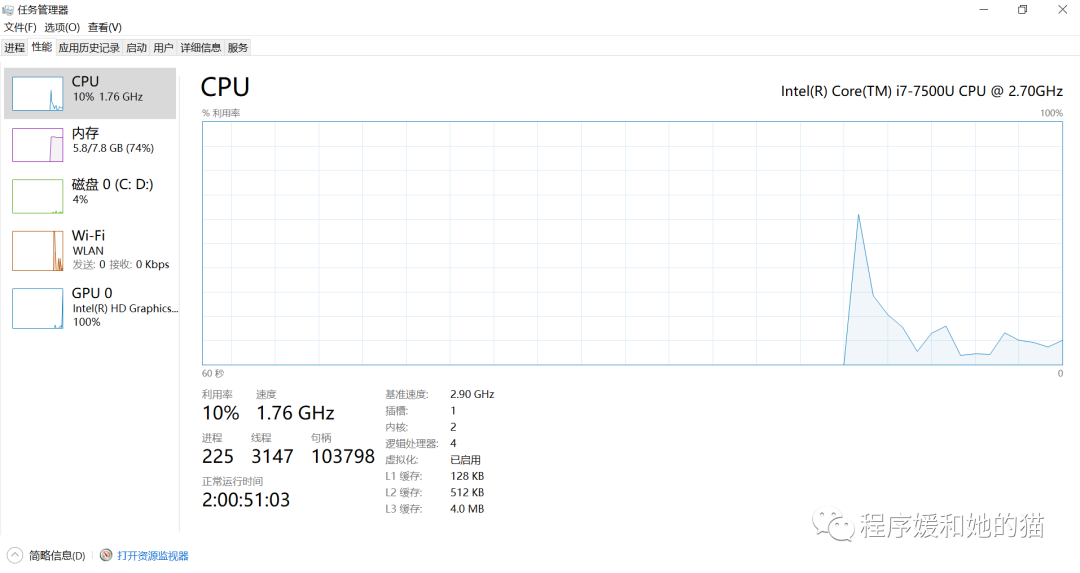 我们可以看自己使用的计算机L1、L2、L3分别多大,查看方式:任务管理器-》性能,见图4右下角,我们发现相比于计算机的内存是几个G,高速缓存几百KB、几MB别真的很小。
