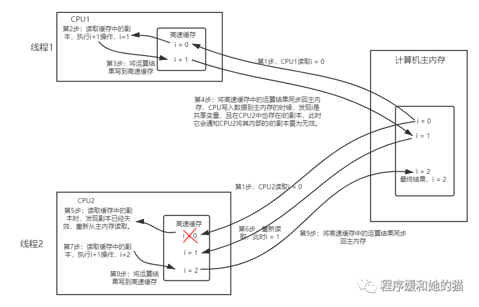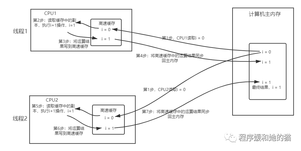 在多核CPU中,每条线程可能运行于不同的CPU中,因此每个线程运行时有自己的高速缓存。在多核CPU环境中,同时有2个线程执行这段代码,假如初始时i的值为0,我们希望两个线程执行完之后i的值变为2。但实际运行结果可能并不是我们想要的。