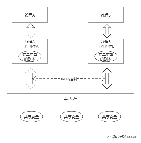 此处的变量与Java编程中所说的变量有所区别,此处的变量包括了实例字段、静态字段和构成数组对象的元素,但不包括局部变量与方法参数,因为后者是在虚拟机栈中定义的,虚拟机栈是线程私有的,不会被共享,自然就不会存在线程之间的竞争问题。可以简单地认为主内存是java虚拟机内存区域中的堆,因为堆是线程共享的区域,堆中的变量如果在多线程中使用,就涉及到数据一致性的问题。